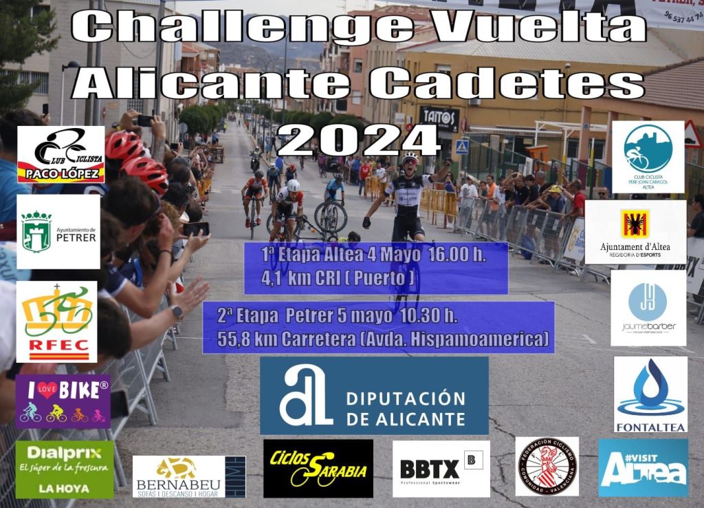 Altea y Petrer acogerán los días 4 y 5 de mayo una nueva edición de la Challenge Vuelta a Alicante cadetes. La competición comenzará con una contrarreloj individual de 4,1 kilómetros en Altea. Al día siguiente se disputará una etapa en línea en Petrer de 56,8 kilómetros de recorrido. Acudirán a la cita los mejores conjuntos nacionales de la categoría en una edición que promete ser vibrante.