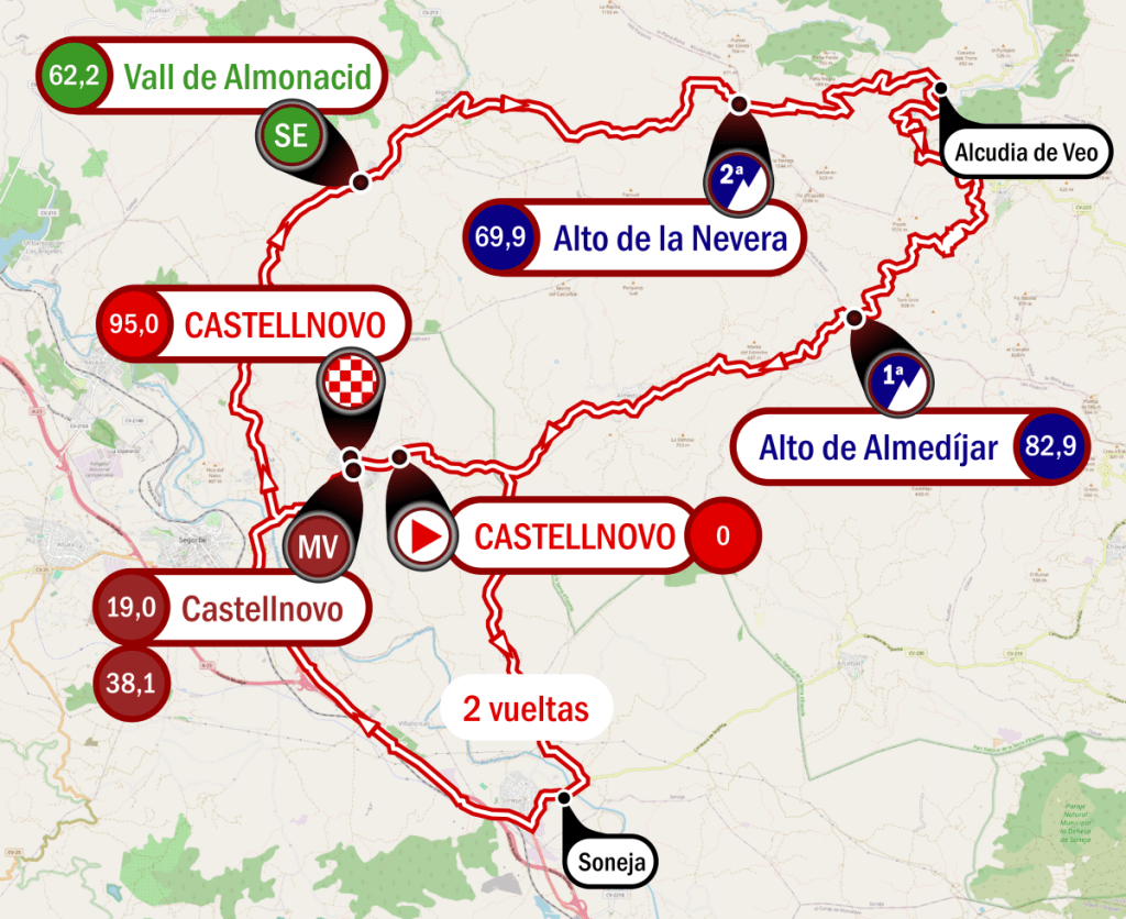La competición continuará el domingo 17 de marzo con una etapa exigente que comenzará a las 10:00 h. Por delante, los protagonistas afrontarán un recorrido montañoso de 95 kilómetros de recorrido. Será una carrera bastante movidita comenzando con la disputa de dos metas volantes en los dos primeros pasos por Castellnovo, seguido de un esprint especial y finalizando con dos puertos en los últimos kilómetros. Los jóvenes afrontarán el Alto de la Nevera (2ª categoría, km 69,9) y el plato fuerte del día, el Alto de Almedíjar (1ª categoría, km 82,9), que cuenta con 9 kilómetros con fuertes pendientes. Se espera que sea una jornada dura donde veremos como responden las piernas de los jóvenes corredores en su segundo día seguido de competición.