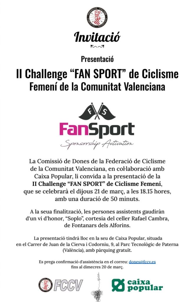 El próximo jueves, día 21 de marzo, se presentará oficialmente la II edición de la Challenge «Fan Sport» de la Comunitat Valenciana de Féminas en los salones de la sede central de Caixa Popular en el Parque Tecnológico de Paterna.