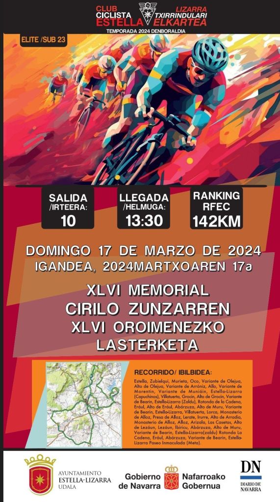 El domingo se disputa en Estella el XLVI Memorial Cirilo Zunzarren para corredores élite y sub 23. Será la primera prueba de la nueva Copa Navarra-Nafarroa Txapelketa. El ya tradicional recorrido final con los pasos por Lezaun, Eraul y Muru en la última treintena de kilómetros deberán dictar sentencia en la prueba navarra. El recorrido repetirá el trazado diseñado durante las últimas campañas por lo que contará con 142 kilómetros, salpicados por hasta seis puertos de montaña.