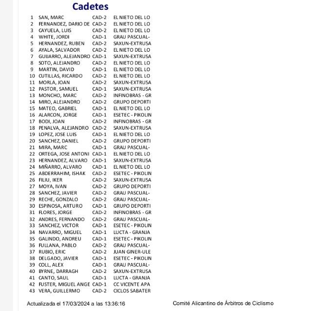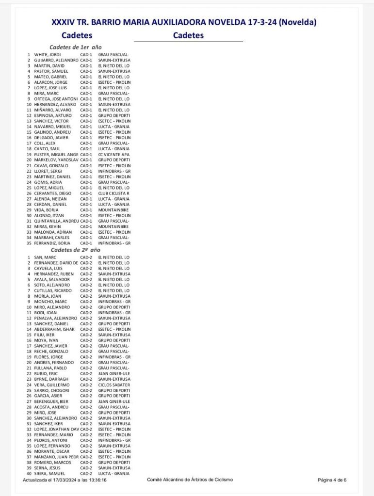 Dominio total de El Nieto del Lobo en el XXXIV Trofeo Barrio María Auxiliadora Novelda, en la carrera de cadetes. Han copado el podio con Marc Sanz, Darío Fernández y Luis Cayuela. Cuarta plaza para Jordi White (Grau Pascual-Netllar), que ganado en cadetes de primer año. Top 10 de Rubén Hernández y Alejandro Guijarro, del Saxun-Extrusax-Primoti.