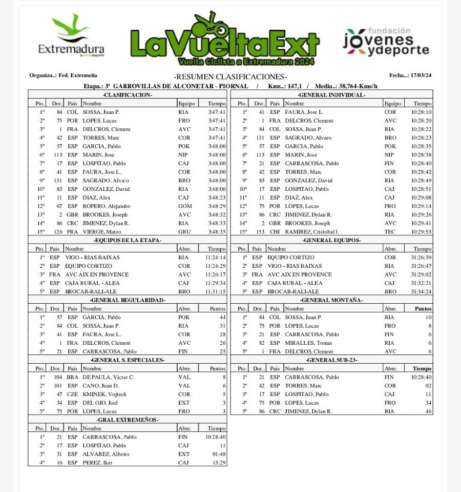 El ciclista murciano de 23 años José Luis Faura, del Equipo Cortizo, se ha alzado con la victoria final tras tres intensos días de competición en la Vuelta Ciclista masculina, que ha finalizado hoy en Piornal. La victoria de esta tercera etapa, que arrancó a las 10 horas de esta mañana en Garrovillas de Alconétar y ha recorrido 147,1 kilómetros, ha sido para el colombiano del Vigo – Rías Baixas Juan Pablo Sossa. El tercer capítulo de la Vuelta a Extremadura ha sido clave en el devenir final de la prueba, con un último tramo de 40 kilómetros en los que se encadenaban los duros puertos de El Torno y el Piornal. Como sucediera el pasado año Pablo Carrascosa (Finisher) ha perdido el maillot amarillo, esta vez en favor de un José Luis Faura. Álvaro Sagrado (Lucta Rali Alé) ha terminado cuarto en la General.