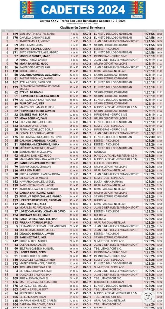 Marc San Martín (El Nieto del Lobo) se ha impuesto esta mañana en el XXXVI Trofeo Sant Josep de Beneixama para corredores cadetes. Su compañero de escuadra Luis Cayuela ha sido segundo y Vicent Andrés (Juan Giner-Ulevel-Vitadinsport) ha completado el podio. Joan Morla (Saxun Extrusax Primoti) ha finalizado cuarto y Óscar Morante (Esetec Pikolinos), quinto. El Nieto del Lobo de nuevo ha impuesto su poderío por escuadras y Luis Cayuela se ha llevado las Metas Volantes.