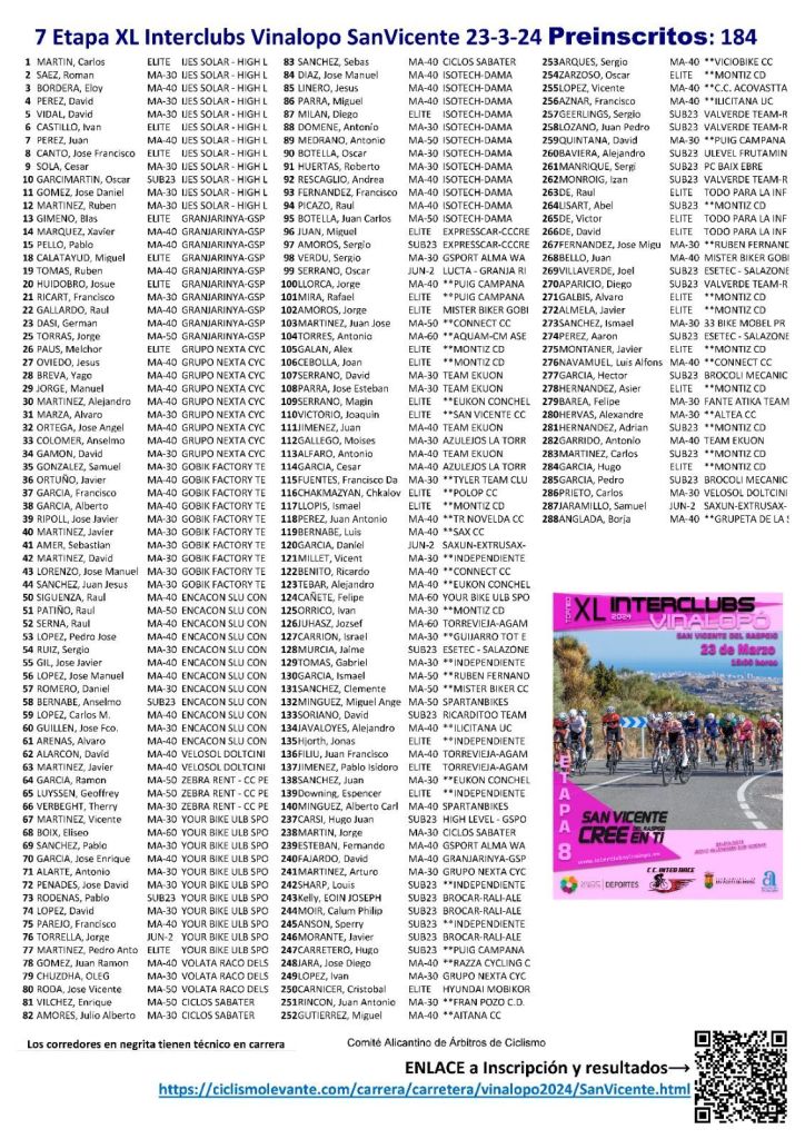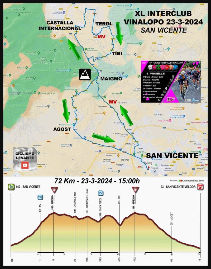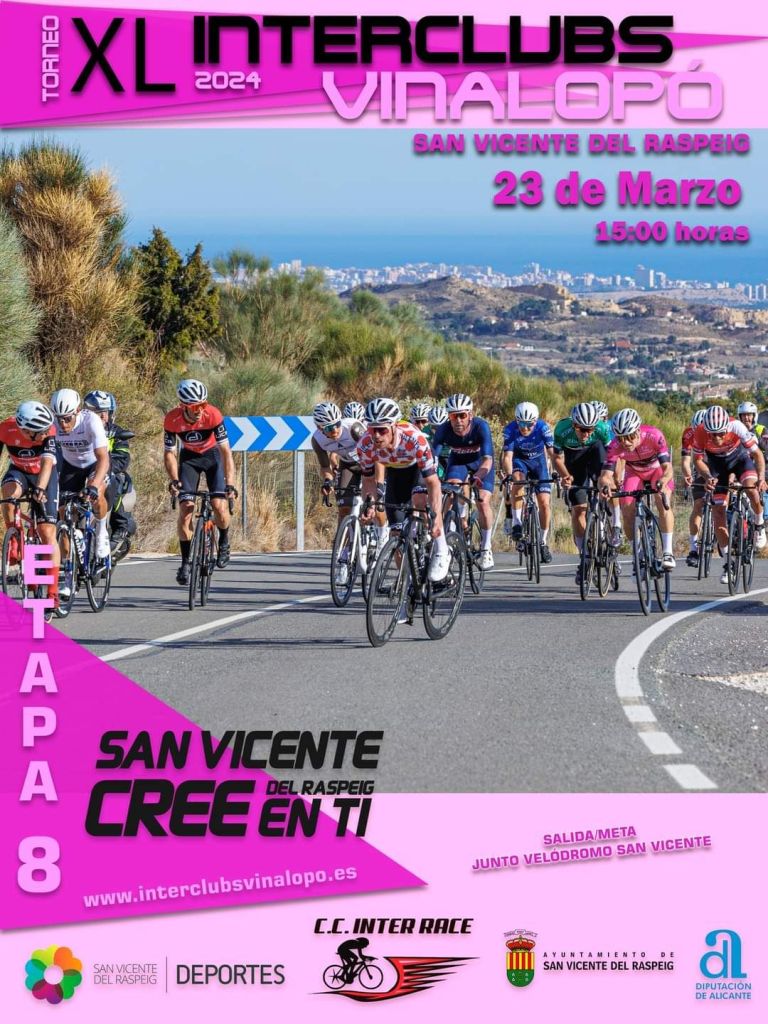 Este sábado, día 23 de marzo, a partir de las las 15:00 horas, se pondrá el punto y final en San Vicente del Raspeig a la 40 edición del Interclubs Vinalopo 2024. Las rampas del Maigmo y el tránsito por la Foia de Castalla protagonistas en un nuevo trazado, entre ellos su paso por Terol, determinará el vencedor del Torneo que comenzó en Benferri y tras siete pruebas finaliza ahora. La salida se dará junto al Velódromo Manuel Guijarro.