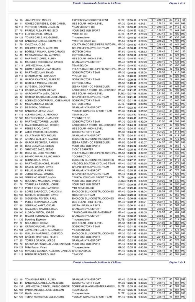 Cebolla también es el mejor Élite y Sub23; Álvaro Marzá domina en M30; Francisco Manuel Fernández, en M40; Miguel Ángel Mínguez, en M50; y Antonio Torres, en M60. Francisco David Fuentes domina la clasificación de la montaña; Rafael Mira, las Metas Volantes; Antonio Domene, la Regularidad; y el Isotech-Dama, la de los equipos.