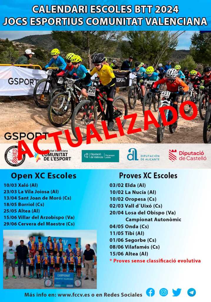 Losa del Obispo organizará el próximo 20 de abril el Campeonato de la Comunitat Valenciana de BTT-XC para las Escuelas de Ciclismo. La prueba se iba a disputar el pasado 24 de febrero en Villar del Arzobispo. El Gran Premio de la Serranía Power Electrónics fue aplazado ante la alerta roja por riesgo de vientos fuertes. Dicha prueba se celebrará el sábado 15 de junio siendo en esta nueva fecha como puntuable para el Open BTT-XC de las Escuelas de Ciclismo.
