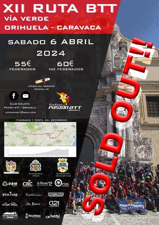 El sábado, 6 de abril, se disputa la XII Ruta BTT Vía Verde Orihuela-Caravaca. El CC Pasión BTT-Orihuela. El control de firmas empezará las 6:15h y la hora de salida a las 6:30. El pelotón partirá desde el Recinto Ferial Los Huertos, Av. Gómez Pardo Ródenas Nº2, de Orihuela, y finalizará en el Santuario de la Vera Cruz de Caravaca.