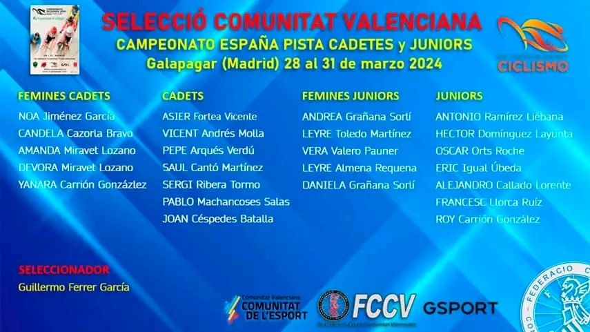 Entre las selecciones favoritas de las pruebas por equipos, la Comunidad Valenciana se postula como la principal candidata ante equipos de la talla de Islas Baleares, Comunidad de Madrid o Euskadi. «El objetivo principal es que sigan acumulando experiencia en la pista e intentar estar en las medallas. En Dos Hermanas rindieron a un gran nivel y se intentará repetir, aunque no será fácil. La baja de Héctor Álvarez es importante. Es una lastima que alguno de sus objetivos en carretera se encuentren tan cerca de Este campeonato, pero tenemos una Selección júnior muy completa que seguro estarán disputando el oro en muchas pruebas», confiesa el seleccionador de la FCCV Guillermo Ferrer.