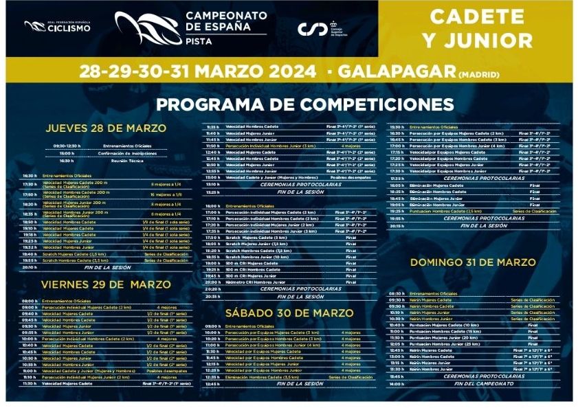 La competición dará hoy, a las 17:00 horas, jueves 28 de marzo con la celebración de las clasificatorias de Velocidad Individual y de Persecución Individual. El viernes 29 de marzo se vivirá una intensa jornada, con comienzo a las 9:00 h. de la mañana y final a las 20:35 h. y donde se conocerán los primeros ganadores en Velocidad y Persecución Individual, Scratch y Km/500 m CRI. El sábado 30, la jornada durará desde las 10:00 h hasta las 20:15 h., donde se darán cita la Persecución por Equipos, Velocidad por Equipos y Eliminación. Por último, el domingo 31, será el turno para la coronación de los nuevos campeones nacionales de Puntuación y Keirin. No obstante, el programa de competición definitivo se puede consultar en el documento adjunto a esta noticia.