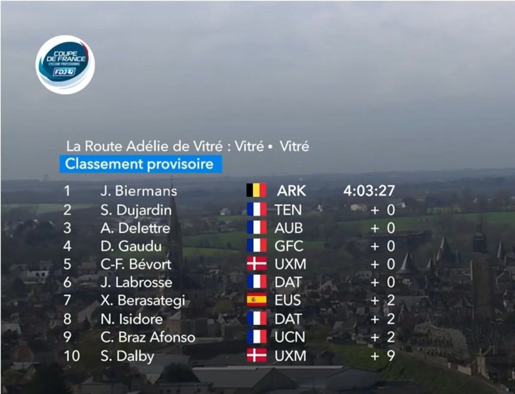 Jenthe Biermans (Arkéa-B&B Hôtels) ganó, este viernes, la 28ª edición de la Route Adélie de Vitré (1.1), séptima prueba de la Copa de Francia FDJ, disputada sobre una distancia de 174,2 kilómetros. El belga venció a Sandy Dujardin (TotalEnergies) y Alexandre Delettre (St-Michel-Mavic-Auber 93), que han completado el podio.