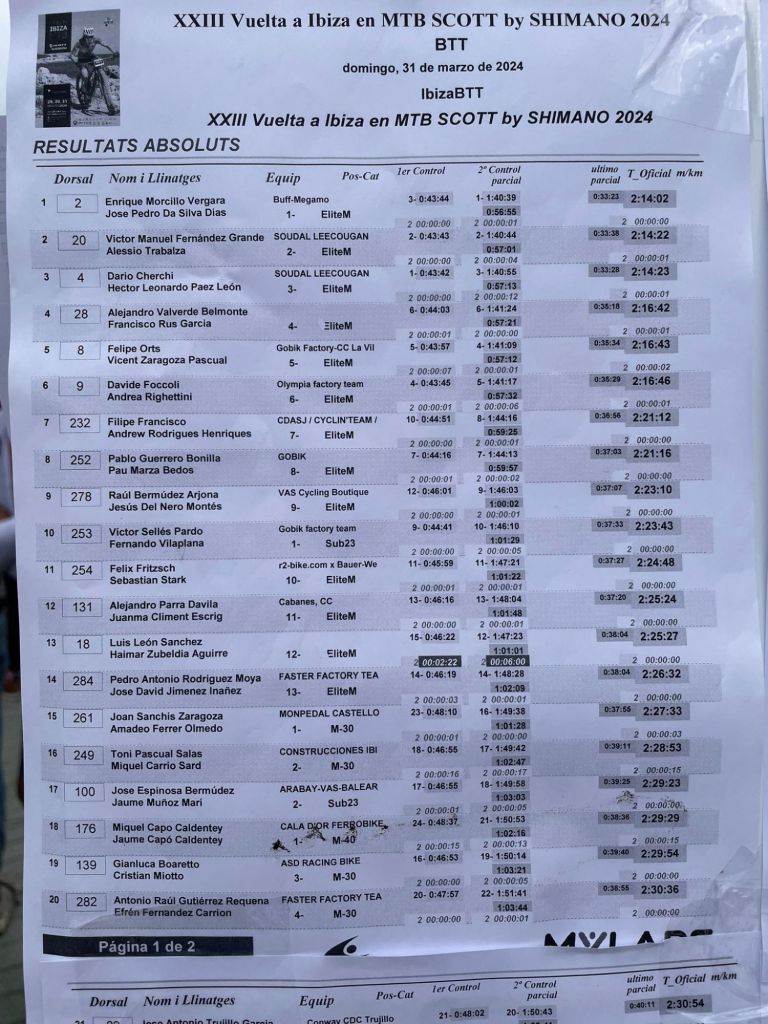 Hoy ha concluido la XXIII Vuelta Ibiza Scott by Shimano donde la victoria de esta edición se la han llevado la pareja compuesta por Dario Cherchi y Leonardo Páez (Soudal Leecougan) y la dupla compuesta por Rosa Van Doorn y Janina Wüst (Buff Megamo). Felipe Orts (La Vila Joiosa Néteo) y Vicent Zaragoza (Gobik Factory Team) han terminado sextos, tras ser hoy quintos en la última jornada; y Víctor Sellés y Fernando Vilaplana, del Gobik Factory Team, décimos, tras acabar en la última jornada octavos. Amparo Chapa e Irene Caminos acaban octavas y 8° en la general.