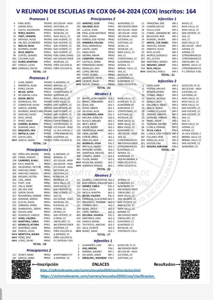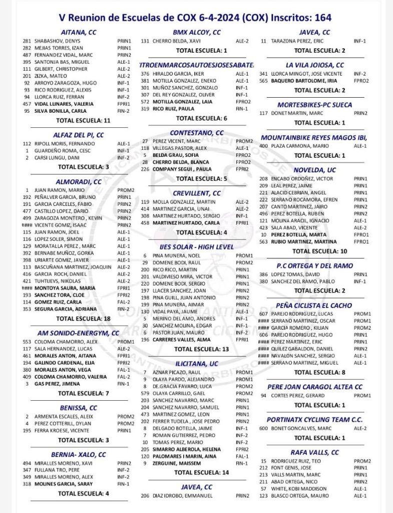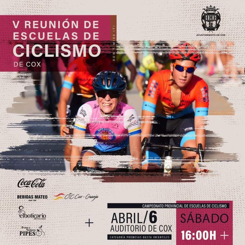 El sábado, día 6 de abril, se disputa en Cox, a partir de 16 horas, la V Reunión de Escuelas de Ciclismo. La competición se desarrolla en los alrededores del Auditorio Josefina Hernández. Será la tercera prueba de la Challenge de Escuelas de la provincia de Alicante.