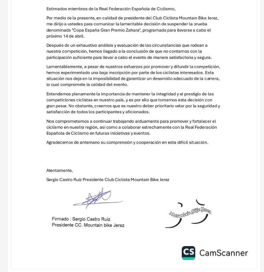La RFEC ha anunciado que el Gran Premio Zahara de la Sierra, tercera prueba de la Copa de España Cadete de carretera, ha sido suspendido. Estaba prevista para el día 14 de abril en tierras gaditanas. Tras la disputa de las prueba de Melilla y Fortuna lidera el Torneo Salvador Ayala (El Nietro del Lobo), con Pachecho Wymmersch (Indeso) y Javier Muñoz (+ Vatios Qatar). Óscar Morante (Esetec Pikolinos) es séptimo.