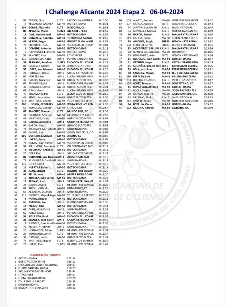 Eloy Teruel (Esetec Salazones Ricardo Fuentes) se ha impuesto esta tarde en la segunda etapa de la I Challenge Aliante 2024 disputada en Benferri en la modalidad de CRI. Han sido 12,200 kilómetros de lucha individual contra las manecillas del reloj. Andrea Rescaglio (Isotech Dama) ha sido segundo y Alejandro Gómiz (Bicicosta), tercero. Teruel es el nuevo líder de la prueba que organiza el Club Ciclista Benferri.