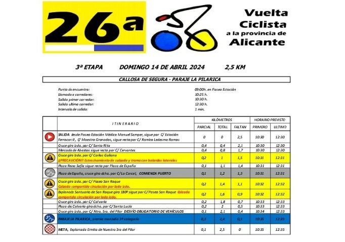 Callosa de Segura acogerá el desenlace final en la tercera etapa el domingo 14 con una cronoescalada de 2,5 kms. con salida desde el Paseo de la Estación que, tras recorrer inicialmente las calles del casco antiguo, se adentrará en la parte alta de la