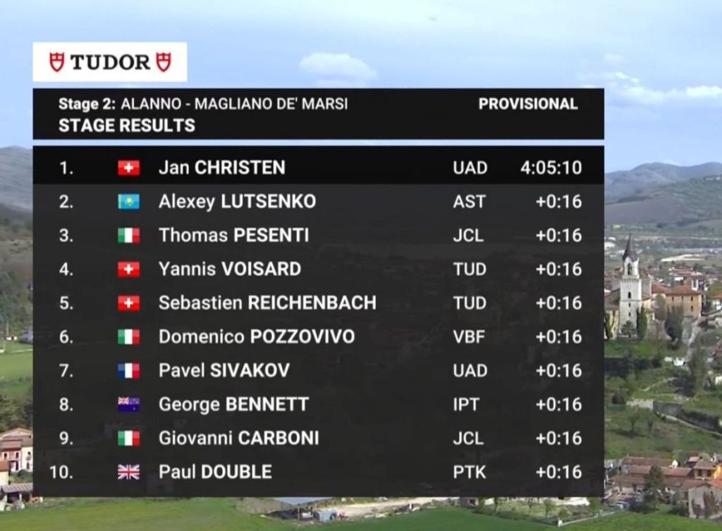Jan Christen (UAE Team Emirates) se ha impuesto hoy en la segunda etapa del Giro d’Abruzzo. El jovencísimo suizo, de sólo 19 años, cruzó en solitario la meta tras una etapa difícil hasta Magliano de Marsi y consiguió además un doblete en la clasificación general. Alexey Lutsenko ( Astana Qazaqstan) ganó el sprint del grupo perseguidor por delante de Thomas Pesenti (JCL Team UKYO).
