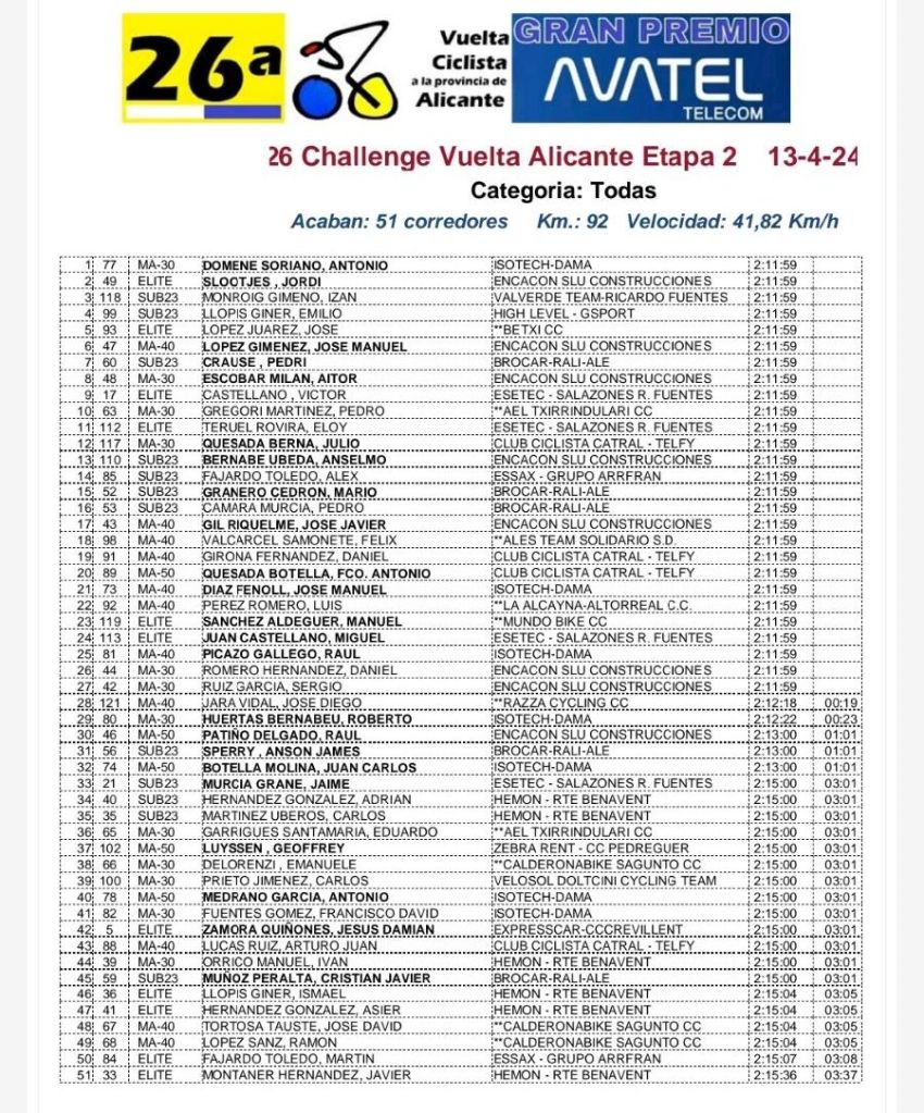 Tras las dos primeras jornadas, Víctor Castellano sigue vestido de amarillo y es el primer élite; Izán Monroig lleva el jersey naranja de mejor joven;Antonio Domene domina en M30; y Daniel Girona (Catral-Telfy), en M40.