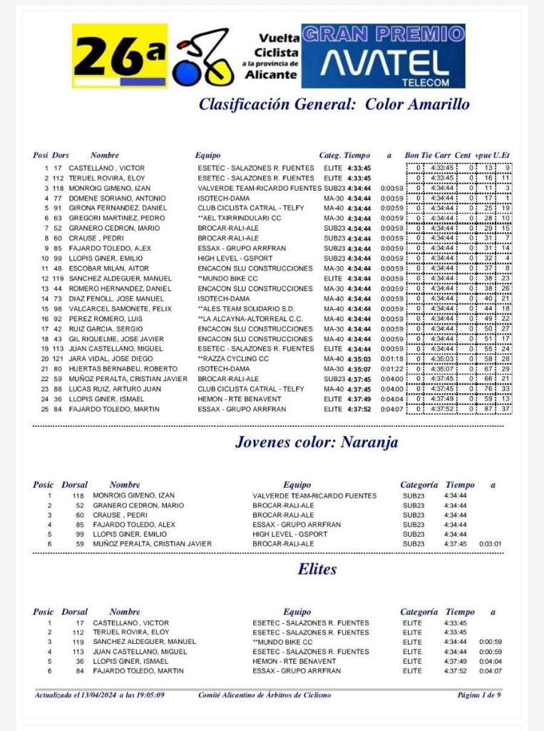 Etapa 1. 12 de abril. San Vicente-Santa Pola. Clasificaciones