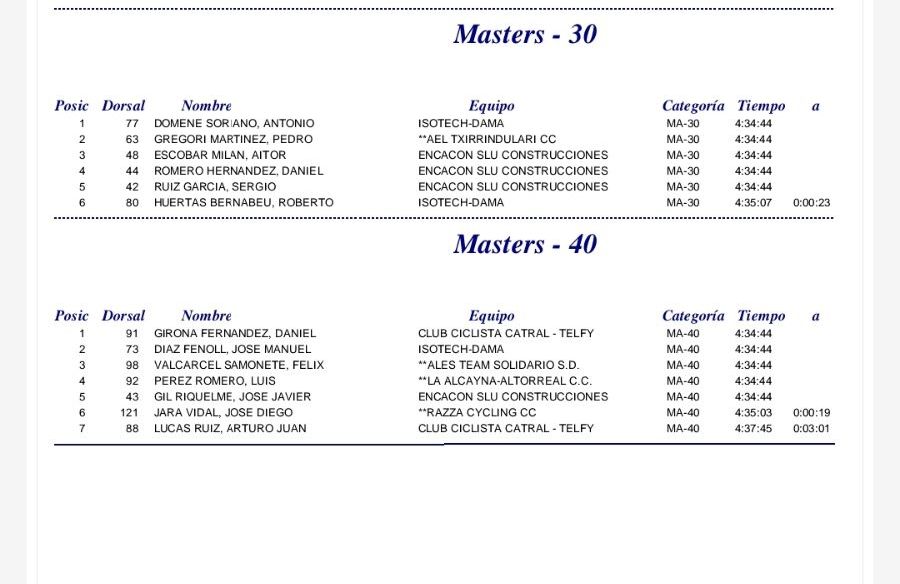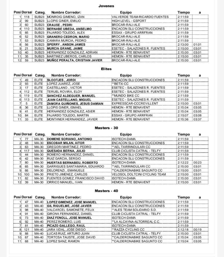 Jordi Slootjes ha sido el mejor élite; Izán Monroig se ha impuesto en Sub 23; Antonio Domene, el M30; José Manuel López (Encacon SLU), en M40; y Francisco Antonio Quesada (CC Catral-Telfy), en M50. El Encacon SLU ha sido el mejor equipo; Raúl Patiño se ha llevado las Metas Volantes y Aitor Escobar, la montaña.