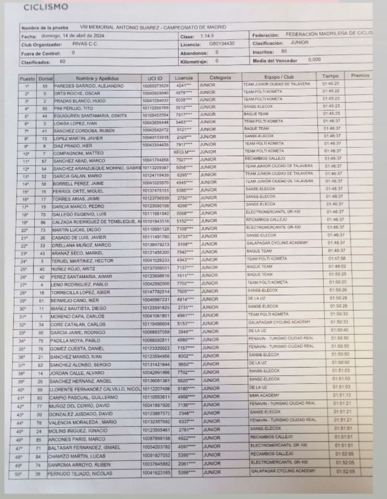 Óscar Orts (Team Polti Kometa) ha finalizado segundo en el VII Memorial Antonio Suárez disputado en Corpa para corredores Júnior. El alicantino se ha impuesto en el premio de la montaña y su equipo ha sido la mejor escuadra. Alejandro Paredes (Ciudad de Talavera) y Hugo Pradas (Team Polti Kometa) ha completado el podio. Padas se ha adjudicado el campeonato de Madrid.