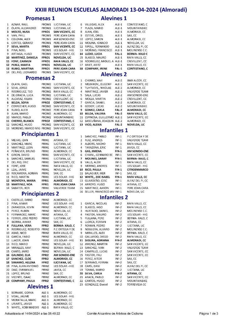 La Unión Ciclista Ilicitana logró el triunfo el sábado en la XXIII Reunión de Escuelas de Almoradí. Los locales ocuparon la segunda plaza y el CC San Vicente finalizó tercero. A nivel individual, triunfos de Raúl Aznar (UC Ilicitana) y Nusa Moltó (CC San Vicente), en Promesas 1; Gael Olaya (UC Ilicitana) y Sofía Belda (Contestano) se impusieron en Promesas 2; Izán Mejías (Aitana) y María Montoya (Almoradí), en Principiantes 1; Darío Castillo (Almoradí) y Vera Fullana (Bernia Xaló), en Principiantes 2; Gorka Bernabé (Almoradí) y Lucía Lledó (Bernia Xaló), en Alevines 1; Xavi Cherro (BMX Alcoy) y Carla Gómez (Almoradí), en Alevines 2; Pablo Sánchez (PC Ortega) y Jimena Gas (AM sonido), en Infantiles 1; y de Nicolás García (Rafa Valls) y Adriana Segura (Almoradí), en Infantiles 2.