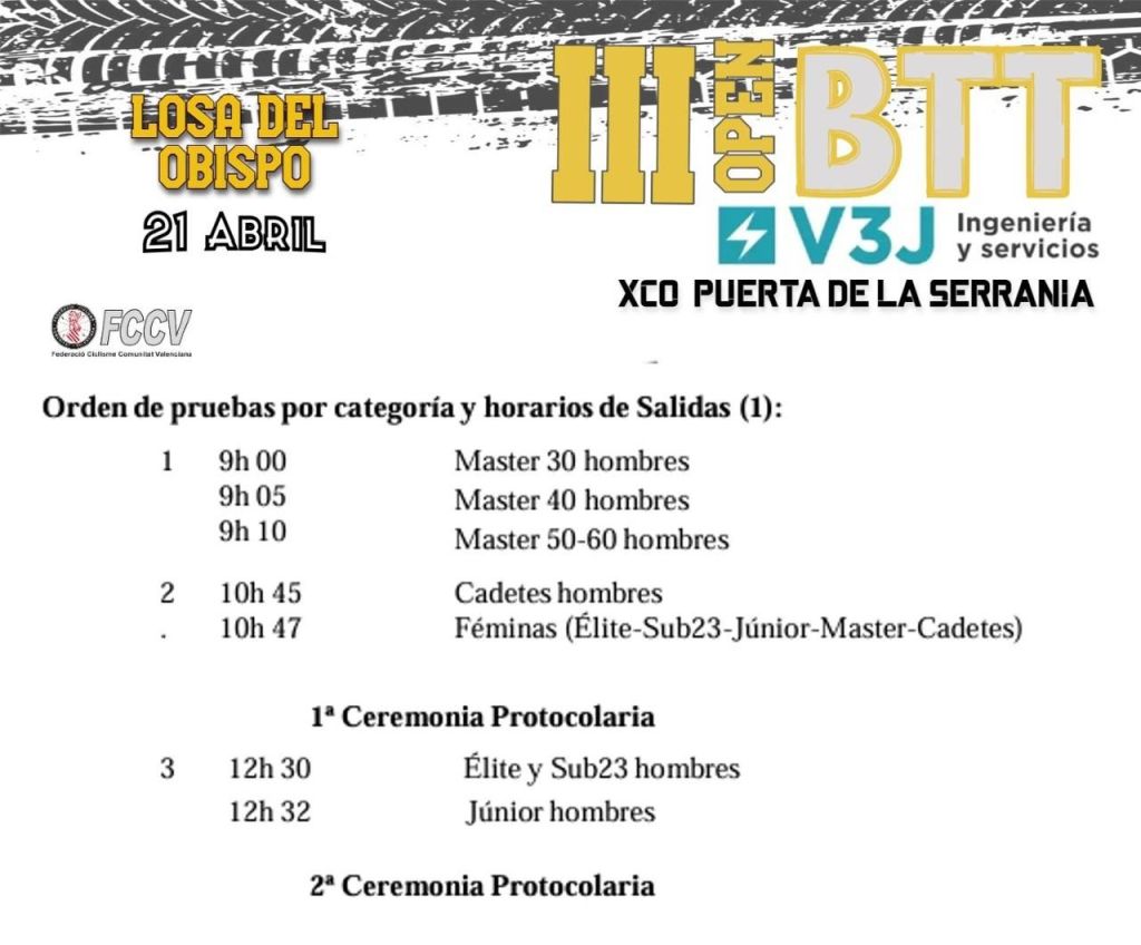 El domingo, 21 de abril, tendrá lugar en Losa del Obispo la segunda prueba puntuable del Open BTT-XC CV, la prueba OPEN XCO PUERTA DE LA SERRANÍA. La prueba contará con más de 80 ciclistas y estará organizada por el CC Losa del Obispo. La recogida de dorsales se realizará desde 7:30h a 8:30h. La hora de salida es a las 9:00.