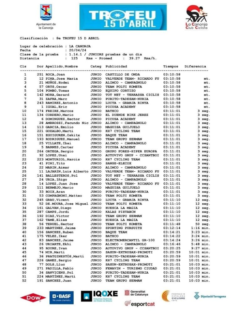 Joan Roca (Castillo de Onda) se ha puesto a La Canonja la octava edición del Trofeu 15 d’Abril. José María Pina (Valverde Team) ha sido segunda y Hodei Muñoz (Alimco) ha completado el podio de la segunda prueba de la Copa España Júnior Cofidis. Óscar Orts (Team Polti Kometa) ha terminado cuarto; Antonio Ramírez (Lucta-Granja Rinya), octavo; y Eric Igual (Picusa Academy), noveno.