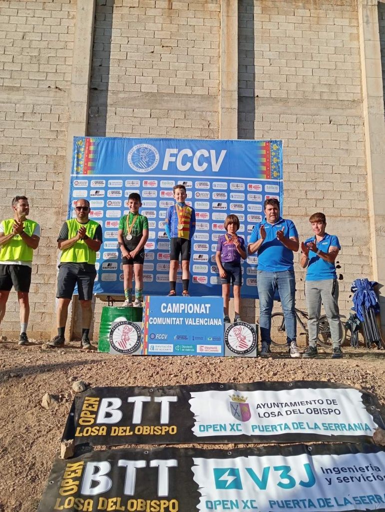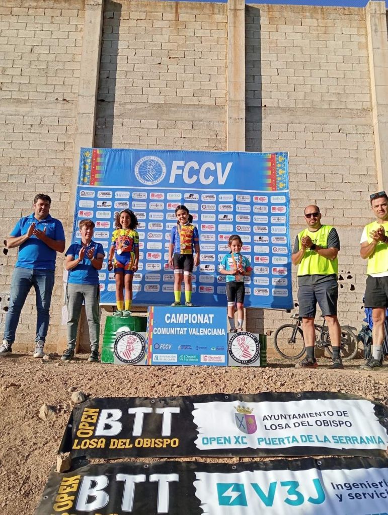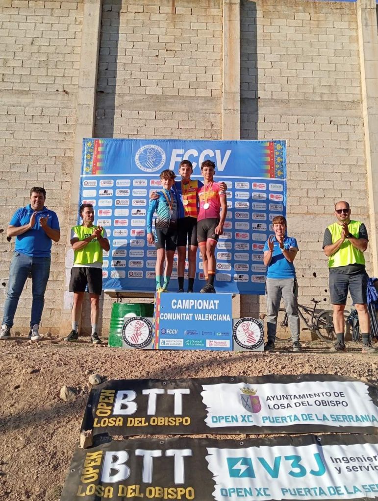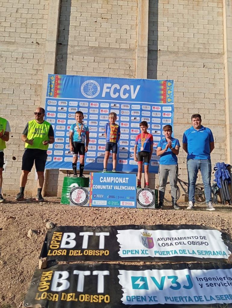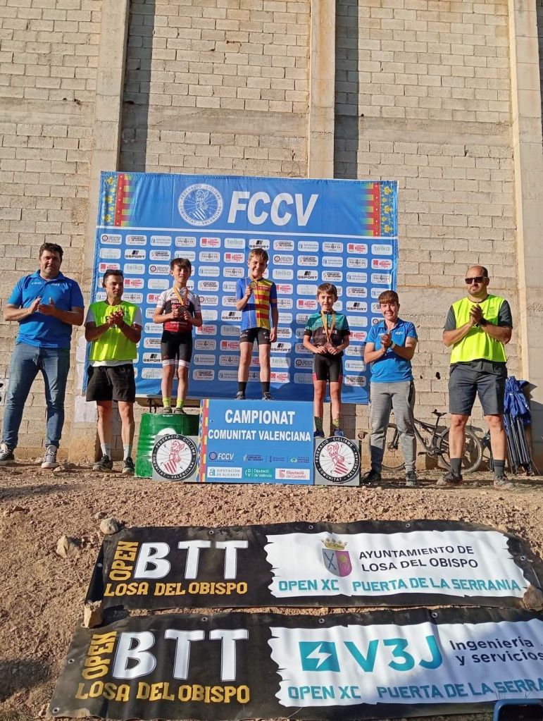 Losa del Obispo ha repartido hoy los títulos autonómicos escolares en el Campeonato de la Comunidad Valenciana BTT-XC Escuelas de Ciclismo que se ha disputado hoy con la presencia de mas de 200 niños. Marc Marín (Orbel) y Vega Morales (AM Sonido) se han impuesto en Alevines 1; Javier Delegido (Citroen Marco) y Valeria Coloma (AM Sonido), en Alevines 2; Martín Fernández (Vall d’Uixó) y Valeria Vidal (Aitana), en Principiantes 1; Álex Moreno (UC Villar) y Elia Ruiz (Costa Azahar), en Principiantes 2; David Chenoll (Big Bikes) y Cristina Iñesta (Crevillent), en Promesas 1; Guillem Verdú (La Vila) y Iria Baquero (La Vila), en Promesas 2; Gonzalo Muñoz (Citroen Marcos) y Ainhoa Cano (Aitana), en Infantiles 1; y Albert Beltrán (Grup Dos Rodes) y Andriana Segura (Almoradí), en Infantiles 2.