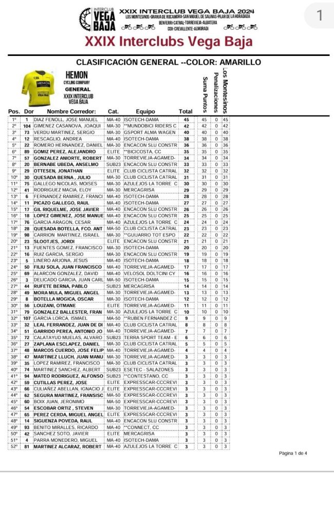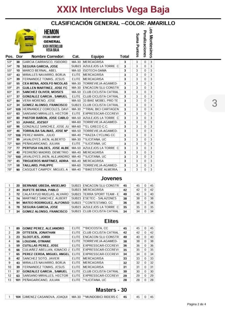 José Manuel Díaz Fenoll lidera también la categoría M40; Alejandro Gómiz (BiciCosta), la de los Elites; Anselmo Bernabé lleva el maillot de los jóvenes; Joaquín Giménez domina entre los M30; y Francisco Antonio Quesada (Catral-Telfy) es el mejor veterano.