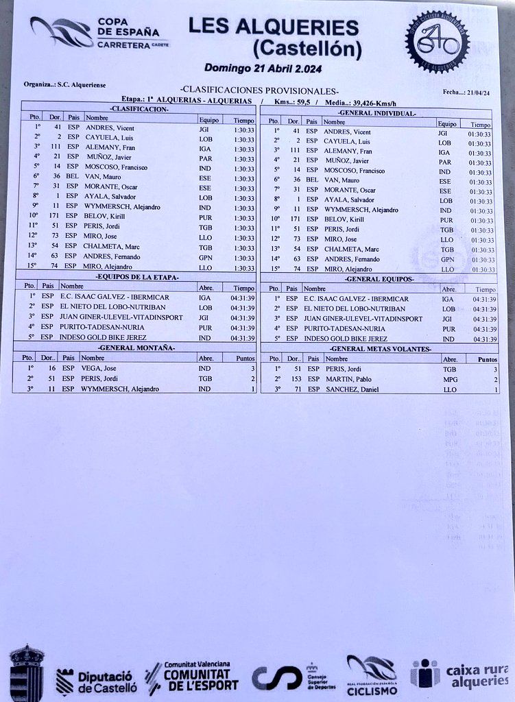 Victoria de Vicent Andrés (Juan Giner-Ulevel Vitaldinsport) en la Copa España Cadete de Les Alqueríes. La carrera se ha resuelto al sprint. Luis Cayuela y Fran Alemany han sido 2° y 3°. Salvador Ayala (Valverde Team) se lleva la general de la primera Copa de España Cadete.
