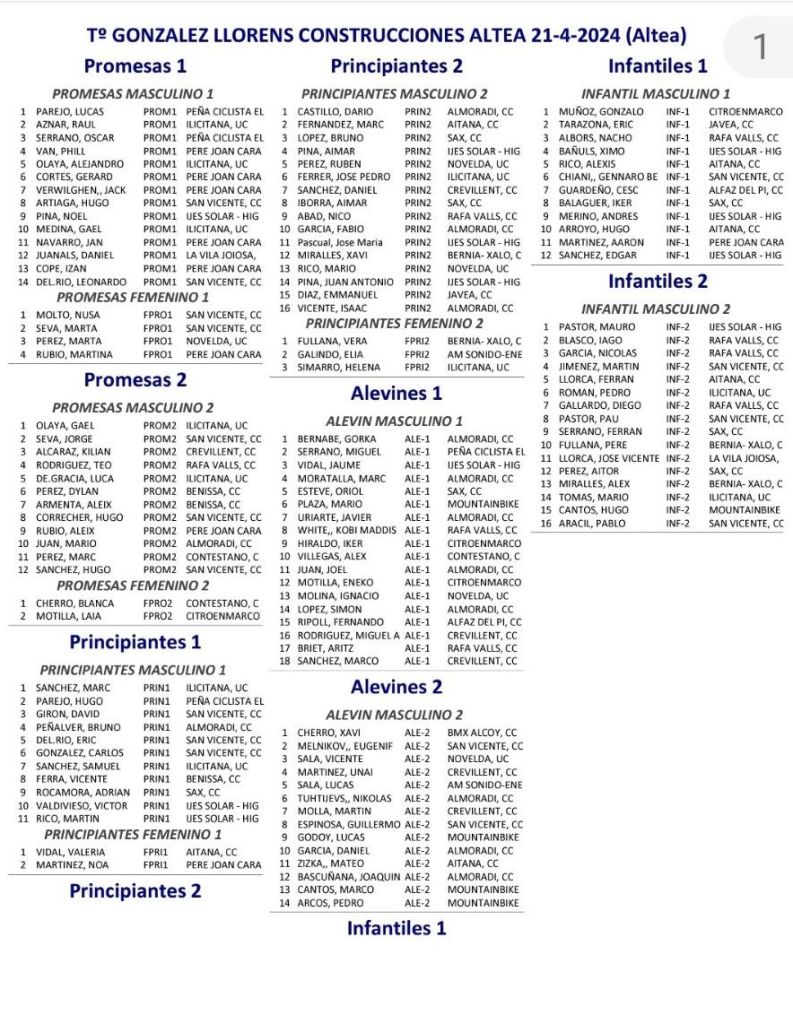 A nivel individual, Lucas Parejo (PC El Cacho) y Nusa Moltó (San Vicente) se impusieron en Promesas 1; Gael Olaya (UC Ilicitana) y Blanca Cherro (Contestano), en Promesas 2; Marc Sánchez (UC Ilicitana) y Valeria Vidal (Aitana), en Principiantes 1; Darío Castillo (Almoradí) y Vera Fullana (Bernia Xaló), en Principiantes 2; Gorka Bernabé (Almoradí), en Alevines 1; Xavi Cherro (BMX Alicante), en Alevines 2; Gonzalo Muñoz (Citroen Marco), en Infantiles 1; y Mauro Pastor (Ijes Solar), en Infantiles 2.