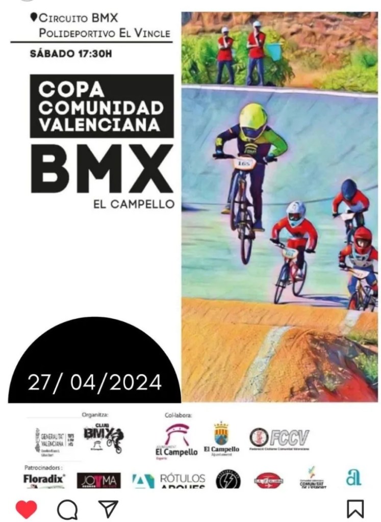 La segunda prueba de la Copa de BMX de la Comunidad Valenciana se disputa el sábado, día 27 de abril, en el Polideportivo El Vincle de El Campello. Noah Ferri (BMX Alcoy) llega como líder a la carrera dentro de la categoría Promesas 5 y 6; Javier Nieto (Yellow MAD BMX), en Promesas 7 y 8; Jorge Mayor (BMX San Vicente) y Julia Smith (El Campello), en Principiantes; Xavi Cherro (BMX Alcoy) y Carla Lozano (BMX Alicante), en Alevines; Chiara Muñoz (Bike Park Costa Blanca) y Vicente García (BMX Alcoy), en Infantiles; Alejandro Baldo (Bike Park Costa Blanca) y Sofía Belén Bull (Bike Park Costa Blanca), en cadetes; Marc Peralta (Ralph’s Bikes), de 17 a 29; Rodrigo Mart. Ridao (BMX San Vicente), en Hombres de 40 a 49; Javi Pastor (Ralph’s Bikes), en Hombres de 50 y más; Juan Miguel Crespo (BMX San Vicente), Máster 30; y, Alejandro Verdú (Bike Park Costa Blanca), en júniors.