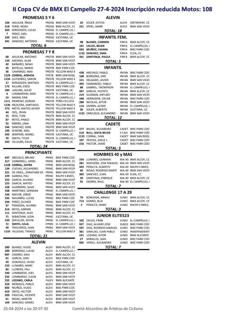 - Categorías: Promesas 7 y 8 Fem., Promesas 7 y 8, Promesas 5 y 6 Fem., Promesas 5 y 6, Principiante Fem., Principiante, Mujeres PRO 17, Mujeres de 50 y mas, Mujeres de 40 a 49, Mujeres de 30 a 39, Mujeres de 13 a 16, Master 50 y mas fem, Master 50 y mas, Master 40 fem., Master 40, Master 30 fem., Master 30, Junior fem., Junior, Infantil fem., Infantil, Hombres PRO 17, Hombres de 50 y mas, Hombres de 40 a 49, Hombres de 30 a 39, Hombres de 13 a 16, Elite-Sub23 Fem., Elite-Sub23, Challenge 17 a 29 Fem., Challenge 17 a 29, Cadete fem., Cadete, Alevin Fem., Alevin