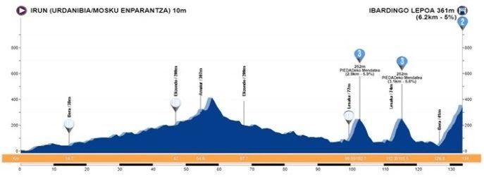 Etapa 1: Irún – Ibardin (Bera); 130,2 (viernes, 26 de abril). La etapa remontará el cauce del río Bidasoa hasta cambiar de sentido en la zona de Amaiur. De vuelta, en las inmediaciones de Lesaka, dos subidas al Alto de la Piedad precederán a la ascensión final a Ibardin, con muro de regalo tras el puerto.
