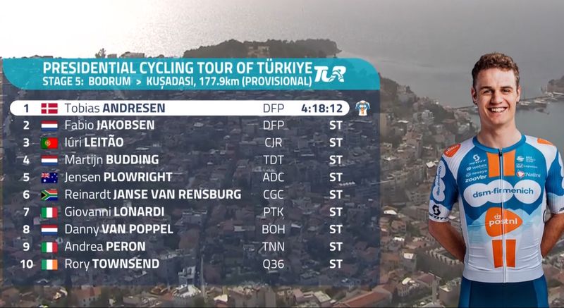 Tobias Lund Andresen ganó la quinta etapa del Tour de Turquía. El corredor del DSM-Firmenich PostNL fue el más rápido en un sprint caótico. Fabio Jakobsen , que vio a su compañero y le dejó ganar, e Iúri Leitão terminaron segundo y tercero. Lund Andresen sigue siendo líder en la clasificación general. Puesto 23 para Manuel Peñalver (Team Polti Kometa), que una vez más ha trabajado para colocar en el esprint a su compañero Giovanni Lonardi, que ha finalizado séptimo.