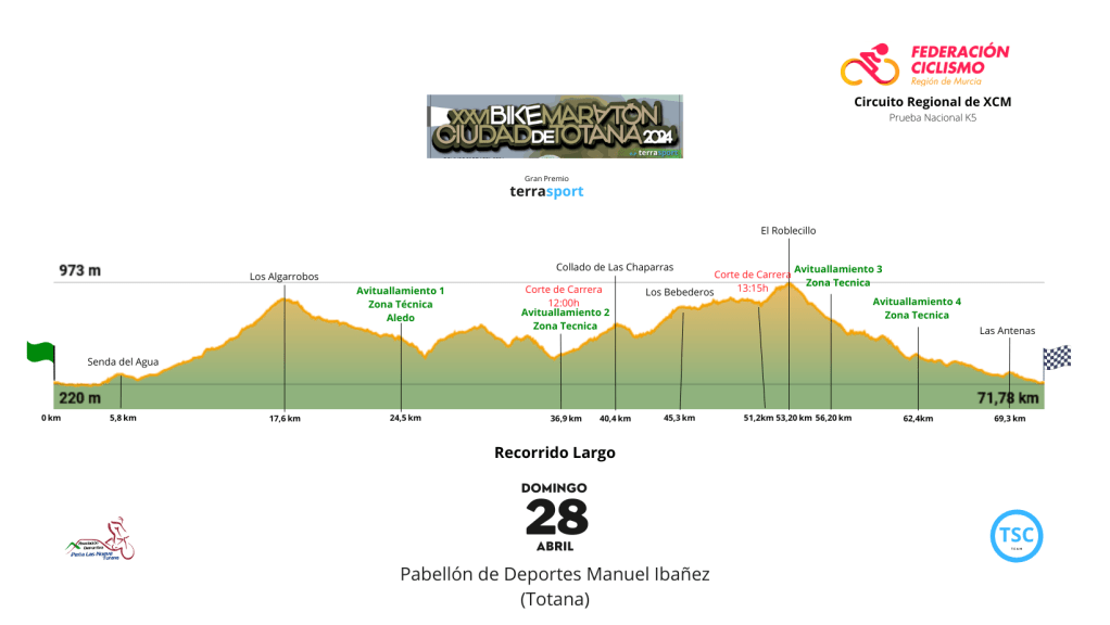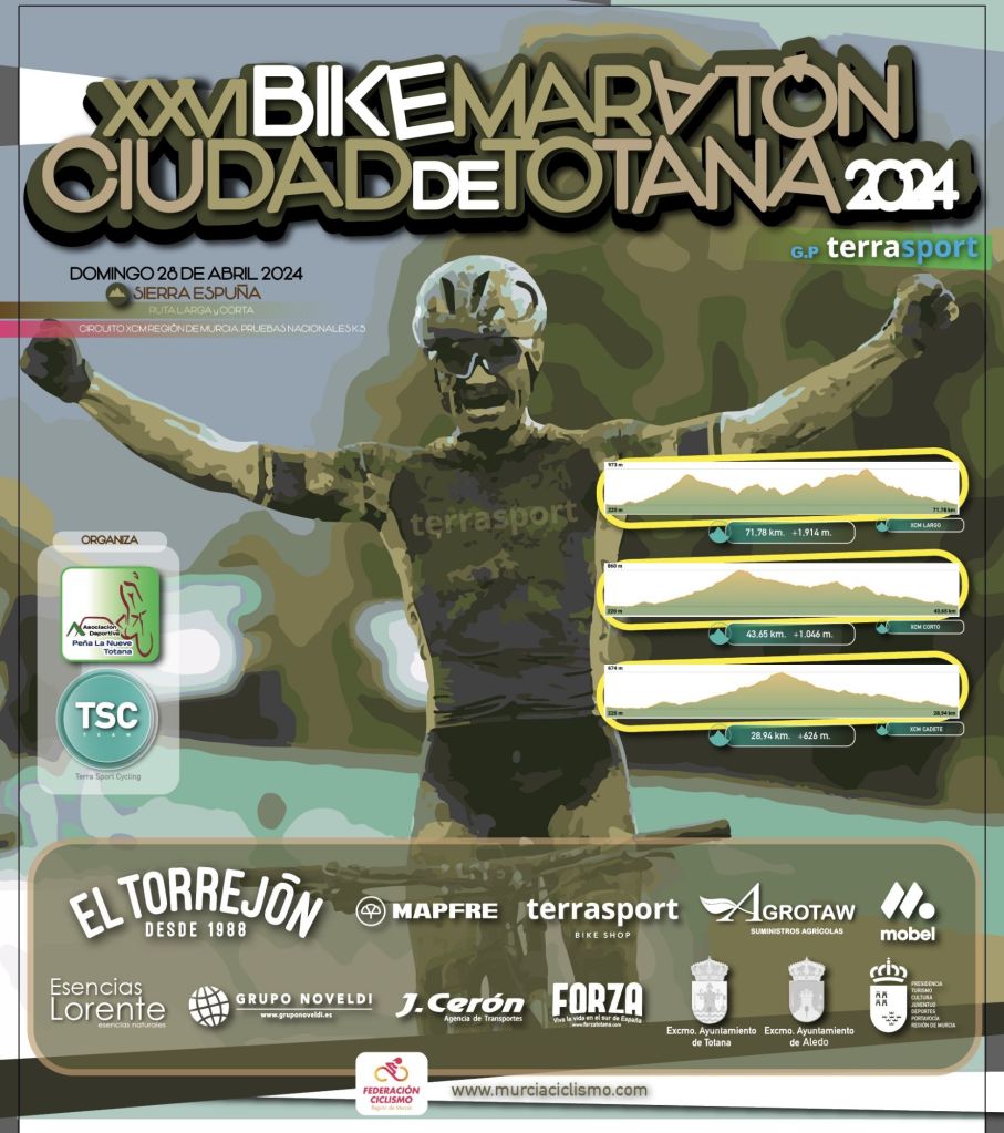 El domingo, día 26 de abril, se disputa la XXVI Bike Maratón «Ciudad de Totana», quinta prueba del Circuito XCM Región de Murcia. La prueba cuenta con tres trazados, el oficial de 71,780 km de recorrido y 1.914 m de desnivel acumulado; otro alternativo de 43,655 km y 1.046 m de desnivel, no puntuable, y otro 28,940 km y 626 m de desnivel exclusivo para las categorías cadetes.