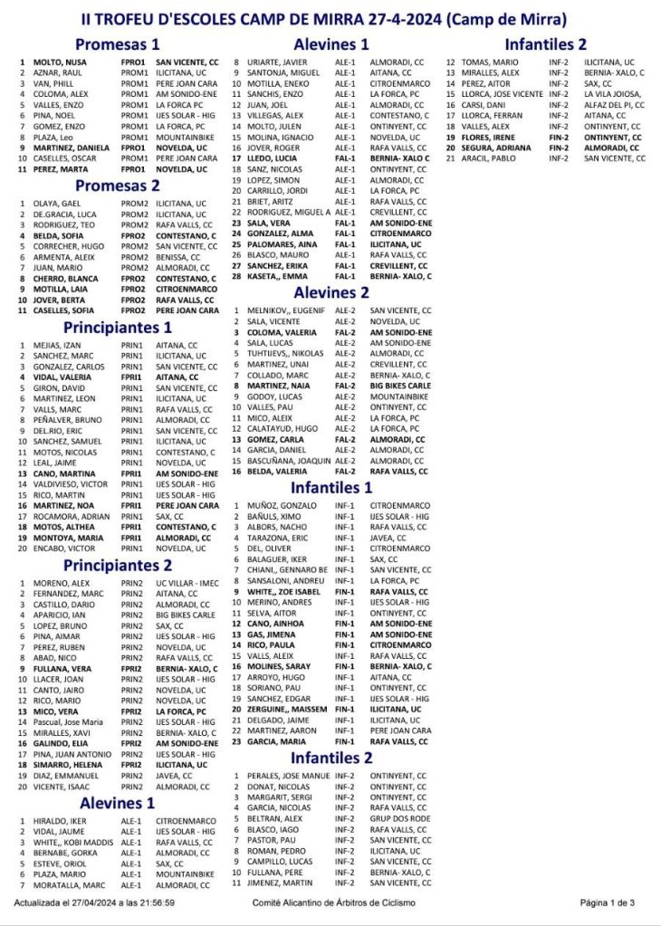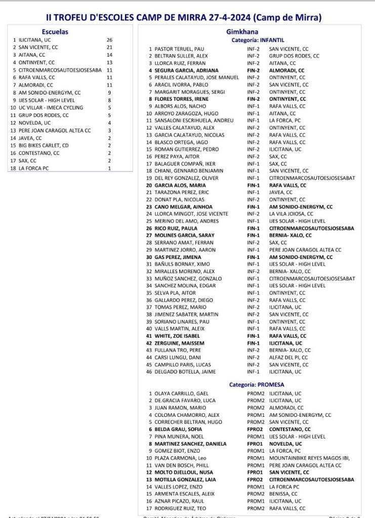 La Unión Ciclista Ilicitana se impuso el sábado en el II Trofeu Escoles de Ciclisme El Camp de Mirra por delante del CC San Vicente y del CC Aitana. A nivel individual, los triunfos fueron para Nusa Moltó (San Vicente) y Raúl Aznar (UC Ilicitana), en Promesas 1; Gael Olaya (UC Ilicitana) y Sofía Belda (CC Contestá), en Promesas 2; Izán Mejías (CC Aitana) y Valeria Vidal (CC Aitana), en Principiantes 1; Álex Moreno (UC Villar) y Vera Fullana (Bernia Xaló), en Principiantes 2; Iker Hiraldo (Citroen Marco) y Lucía Lledó (Bernia Xaló), en Alevines 1; Eugeni Melnikov (San Vicente) y Valeria Coloma (AM Sonido), en Alevines 2; Gonzalo Muñoz (Citroen Marco) y Zoé Isabel White (Rafa Valls), en Infantiles 1; y José Manuel Perales (Ontinyent) e Irene Flores (Ontinyent), en Infantiles 2.