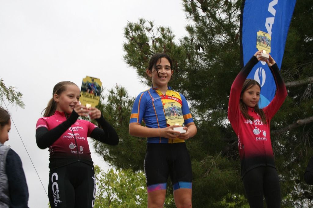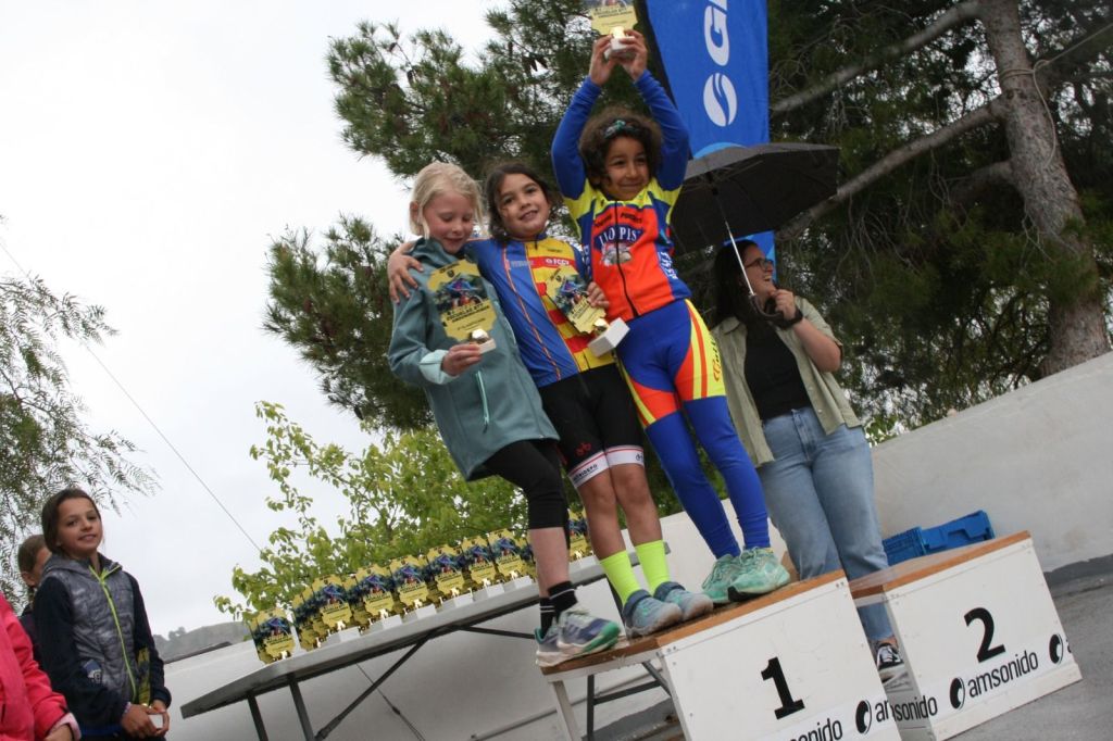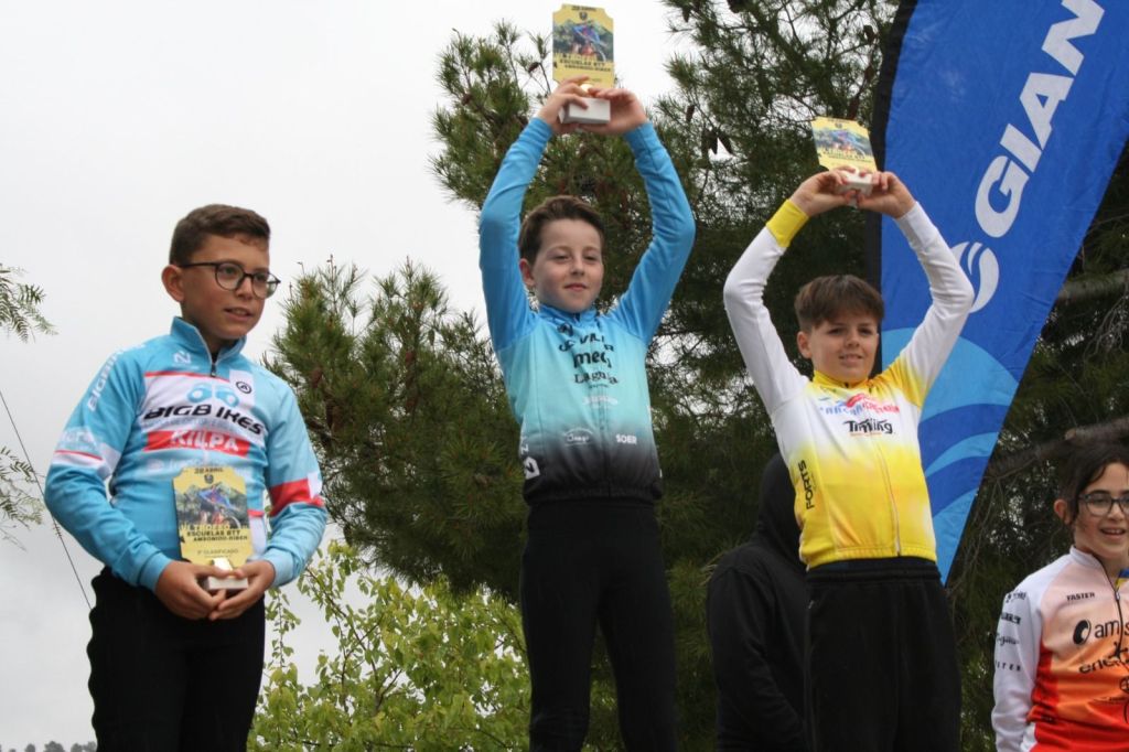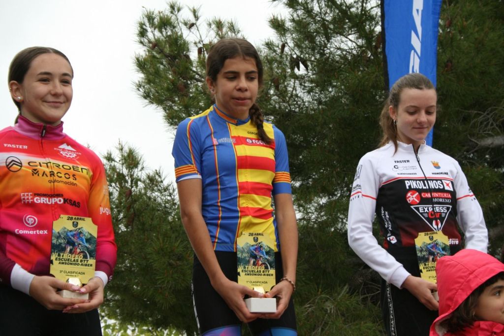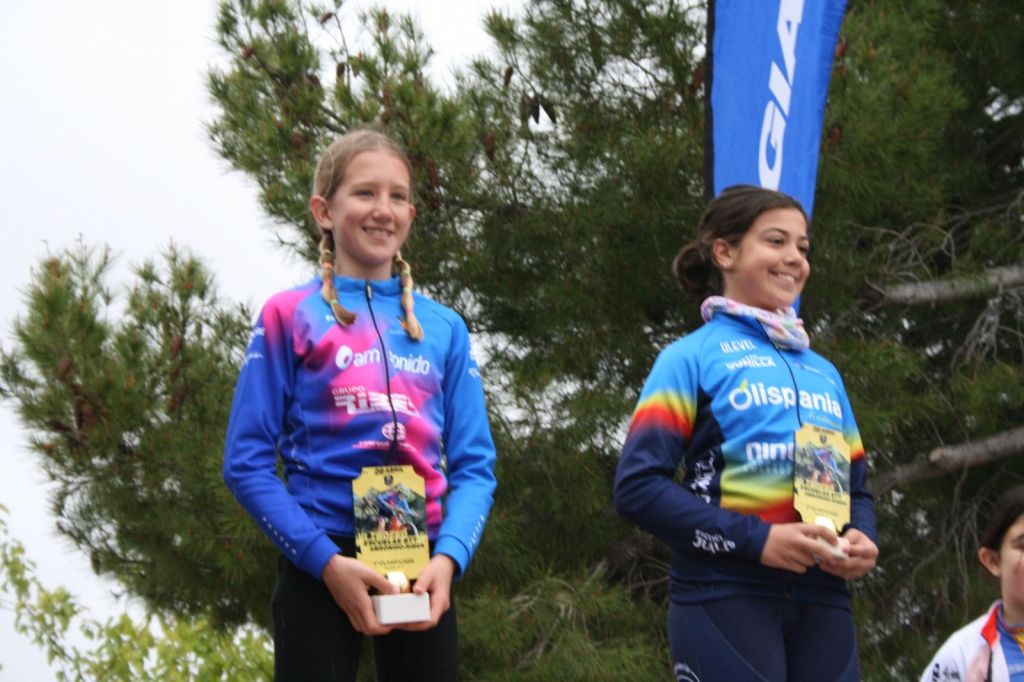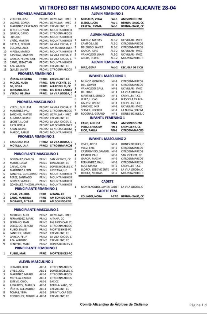 Tibi ha acogido hoy en la Avenida La Pau el VI Trofeo Escuelas BTT AM Sonido-Riber. José Verdejo (UC Villar) y Cristina Iñesta (Crevillent) se han impuesto en Promesas 1; Guillem Verdú (La Vila) e Iria Baquero (La Vila), en Promesas 2; Carlos González (San Vicente) y Valeria Vidal (Aitana), en Principiantes 1; Álex Moreno (UC Villar) y Mar Rubio (Mortesbikes), en Principiantes 2; Iker Hiraldo (Citroen Marcos) y Vega Morales (AM Sonido), en Alevines 1; Matías Lacruz (UC Villar) y Gema Díaz (Orbel), en Alevines 2; Gonzalo Muñoz (Citroen Marcos) y Ainhoa Cano (AM Sonido), en Infantiles 1; y Aitor Vives (Dones Bicicles), en Infantiles 2; y Javier Monteagudo (La Vila) y Nora Collado (Bernia Xaló), en cadetes.