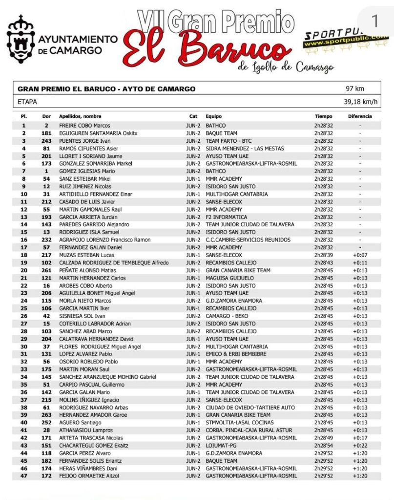Marcos Freire (Bathco Cycling Team) se adjudicó el GP El Baruco disputado en Cantabria para corredores Júnior. Oskix Eguiguren (Baqué) e Iván Puentes (Farto Team) completaron el podio. Jaume Lloret (Ayuso Team) finalizó quinto.