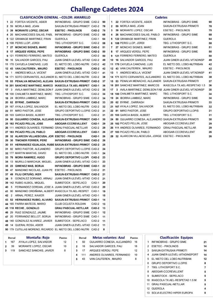 Fortea sigue de líder de la General; Alejandro Guijarro (Saxun-Extrusax-Primoti) lleva el maillot de las MV; y Salvador Ayala (El Nieto del Lobo) el de la Montaña, que ante su ausencia en la carrera de hoy lo ha lucido en el podio Óscar Morante. AVANCE