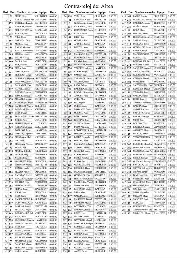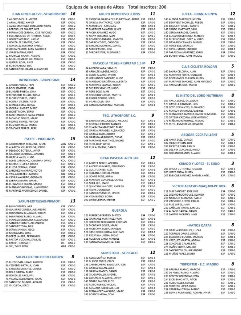 En la lista de preinscritos aparecen 200 corredores y 19 escuadras. De la Comunidad Valenciana competirán Juan Giner-Ulevel-Vitadinsport, Infinobras Grupo-Sime, Esetec Pikolinos, Saxun Extrusax Primoti, Solvi-Electro Hiper Europa, GD Llopis, Ikascola TX, TBG Lithosport, Grau Pascual-Netlar, Guerola, Abogar Crevillente, Lucta Granja Rinya y Sumistock-Sepelaco. A ellos hay que unir: San Fe-Granada, López-El Ejido, Víctor Astasio-Maquivi-Pcbox-Goldman, Club Ciclista Roldán, El Nieto del Lobo, +Vatios Qatar, Triporter EC Magro y ECLM Illes Balears.