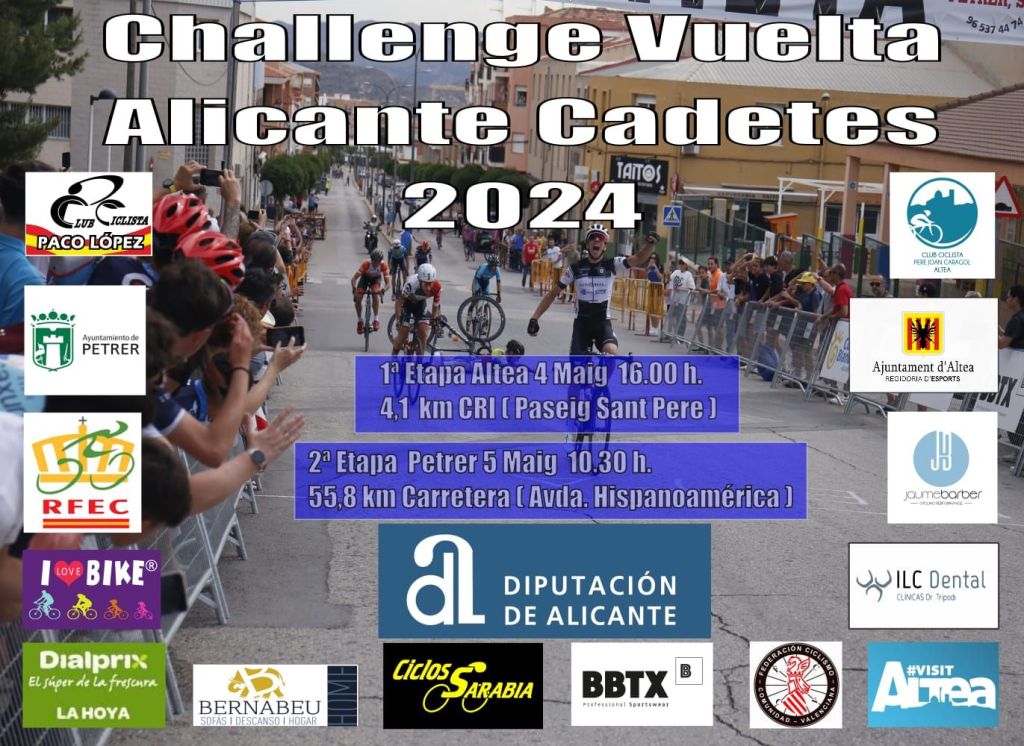 Altea y Petrer acogerán los días 4 y 5 de mayo una nueva edición de la Challenge Vuelta a Alicante de Cadetes. La competición comenzará con una contrarreloj individual de 4,1 kilómetros en Altea. Al día siguiente se disputará una etapa en línea en Petrer de 56,8 kilómetros de recorrido. Acudirán a la cita los mejores conjuntos nacionales de la categoría en una edición que promete ser vibrante.