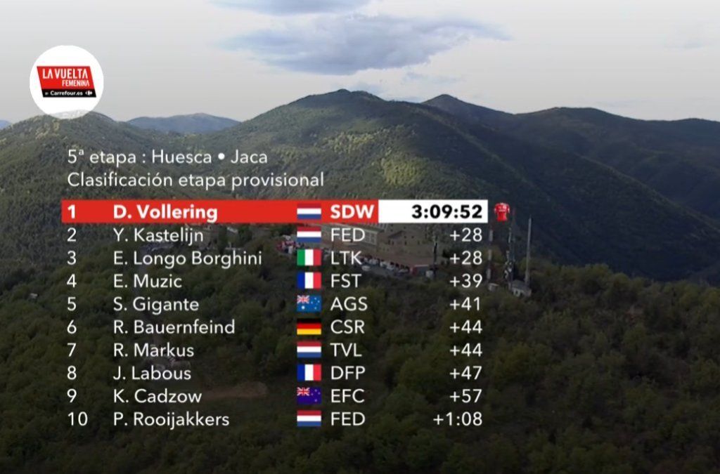 Demi Vollering quiere revancha y ya comanda en La Vuelta Femenina 24 by Carrefour.es desde el primer golpe. La líder del Team SD Worx-Protime, después de su segundo puesto en la pasada edición y un inicio de temporada menos exitoso de lo esperado, no ha dejado pasar la ocasión de dejar su sello en la primera de las llegadas en alto de la carrera española, que en su quinta etapa recorría 113,9 kilómetros con salida desde Huesca y llegada en el Alto del Fuerte Rapitán, en Jaca. La neerlandesa no ha tenido rival en el último kilómetro de la cima aragonesa, y aventaja en 31 segundos a Elisa Longo Borghini (Lidl-Trek) y en 53 a Riejanne Markus (Team Visma-Lease a Bike) a las puertas de una segunda etapa de montaña en La Laguna Negra de Vinuesa.