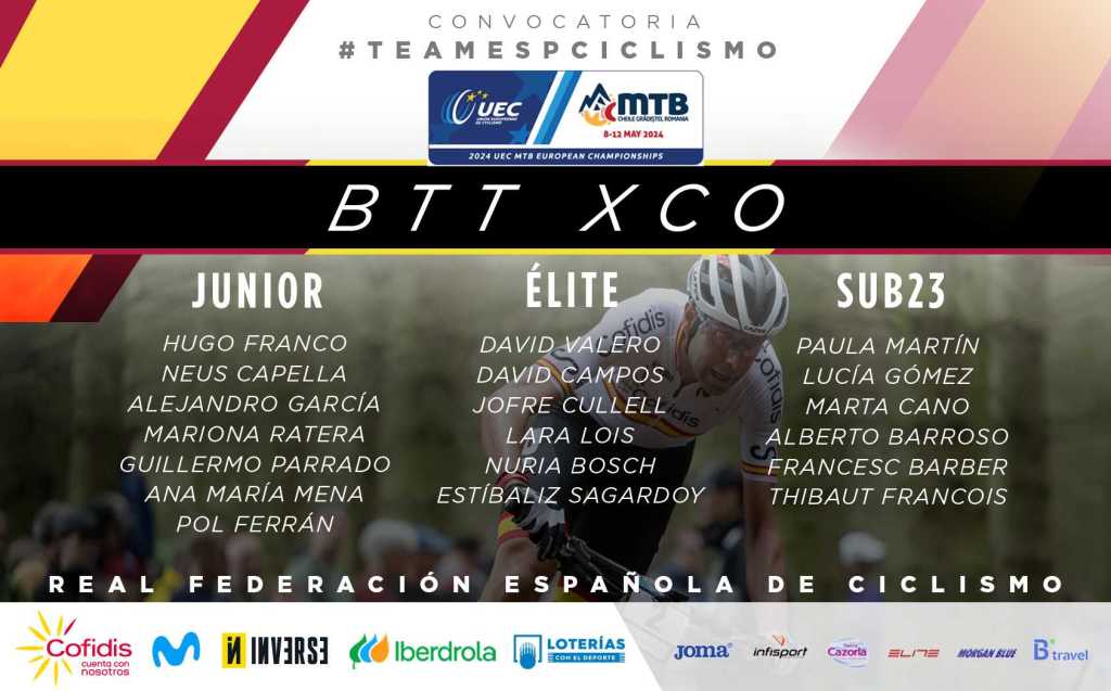 Los seleccionadores nacionales Mikel Zabala y Anna Villar contarán en este Europeo de Cheile Gradistei con un grupo élite compuesto por seis ciclistas: David Valero, David Campos, Jofre Cullell, Lara Lois, Nuria Bosch y Estíbaliz Sagardoy. Los sub23 que estarán con la selección española en Rumanía serán Marta Cano, Paula Martín, Lucía Gómez, Alberto Barroso, Francesc Barber y Thibaut Francois, mientras que los júniors del equipo nacional serán Neus Capella, Mariona Ratera, Ana María Mena, Hugo Franco, Alejandro García, Guillermo Parrado y Pol Ferrán.