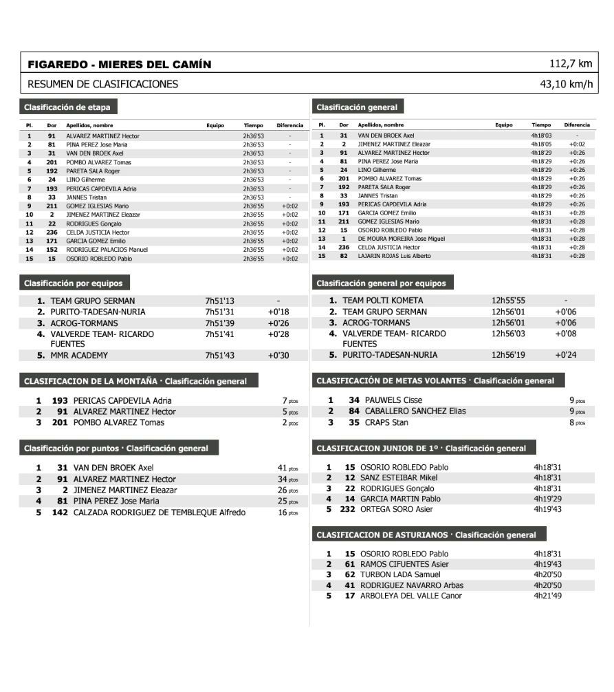 Héctor Álvarez (Lucta-Granja Rinya) se ha impuesto hoy en la segunda jornada de la XXII Vuelta a la Montaña Central de Asturias Júnior con final en Mieres. José María Pina (Valverde-Ricardo Fuentes) ha sido segundo y al líder de la ronda asturiana, el belga Axel Van den Broek (Acrog-Tormans), tercero. Puesto 12 para Héctor Celda. Héctor Álvarez es tercero en la general, a 26 segundos del primer clasificado. Avance