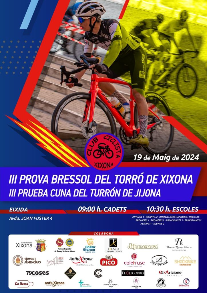 La III Prova Bressol del Torró de Xixona de Escuelas y Cadetes se disputará el domingo, 19 de mayo. Será la octava jornada Challenge de Escuelas de la provincia de Alicante. El Club Ciclista Xixona ha decidido cambiar de ubicación de la carrera por la coincidencia con las comuniones, al polígono Segorb, con salida y meta en la calle Joan Fuster, (Colegio Sagrada Familia y la empresa Antiu Jijona), con el fin de evitar las molestias por dicho acontecimiento religioso y sobre todo, para prevenir accidentes por la aglomeración de gente que vaya a dicho actor. El recorrido será el mismo de la primera edición con una distancia de 2 kilómetros y 300 metros, con un desnivel de 61 metros para Infantiles y Cadetes.