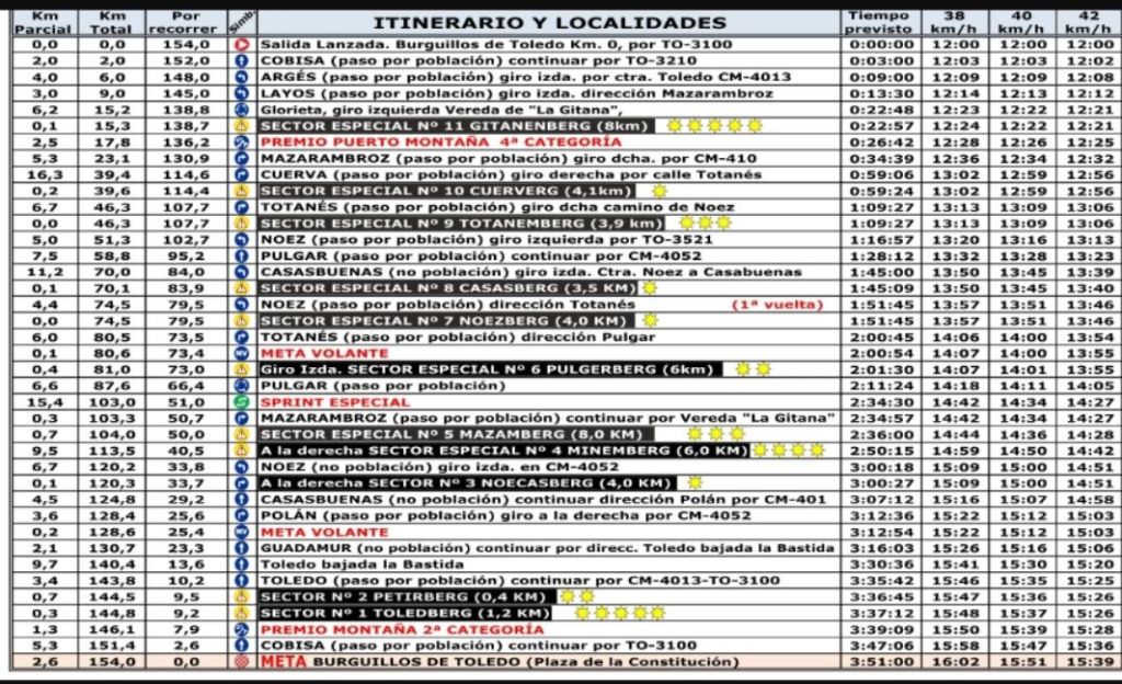 La ‘Clásica’ comenzará a las 12:00 en la zona del polideportivo de Burguillos, donde también estará ubicada la meta. Los puntos clave en los 154 kilómetros están señalados en once muros calificados por dureza, al modo belga. Desde el primero, el sector 11 denominado Gitanemberg, con 7,9 kilómetros y cinco estrellas (el máximo) al Toledberg, que es el último, sector 1 y también de cinco estrellas (en el que se suele decidir la carrera), pasando por el complicado Totanemberg (3 estrellas), Mazamberg (3 estrellas) o Minemberg (4 estrellas y muy cerca del final).