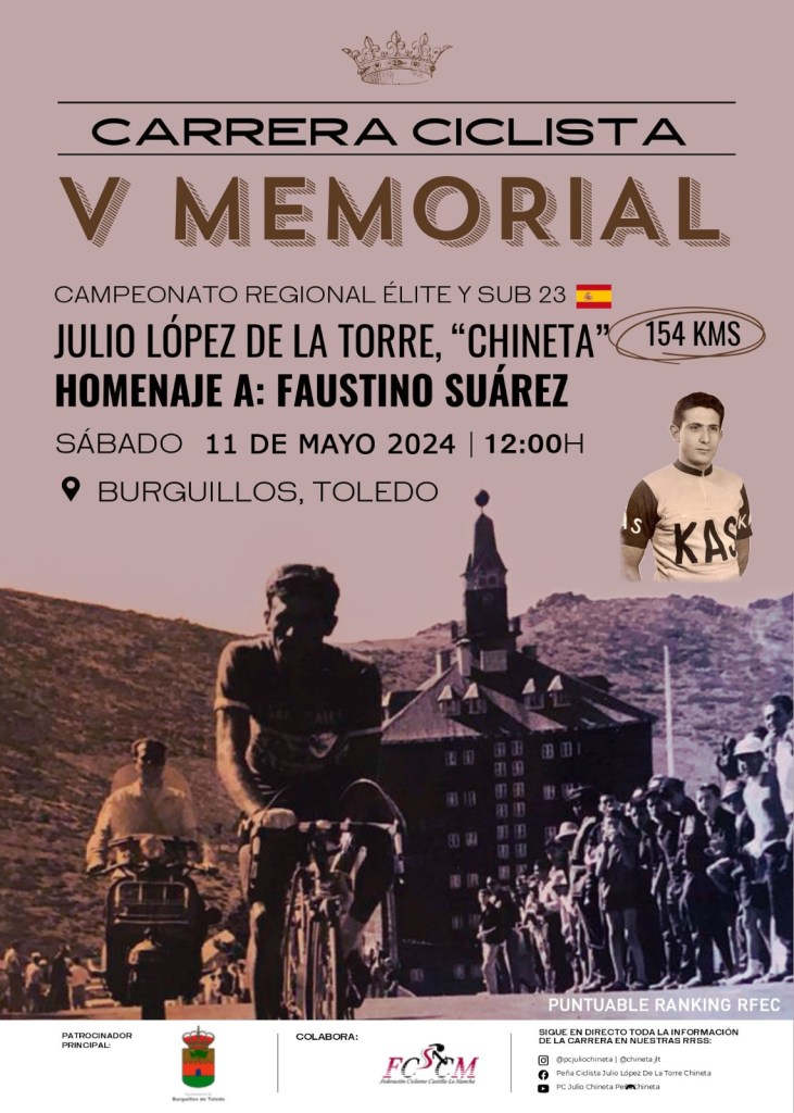 Todo preparado en Burguillos (Toledo) para acoger este sábado 11 de mayo el Memorial Julio López de la Torre ‘Chineta’ de ciclismo. Esta quinta edición se vivirá también de un modo especial por dos acontecimientos novedosos. Por un lado, la prueba se ha elegido como sede del Campeonato de Castilla-La Mancha de carretera 2024 para la categoría élite/sub23. Además, será un homenaje a Faustino Suárez, persona muy querida en el mundo del ciclismo que lleva toda su vida organizando carreras y que a sus 85 años aún sigue montando en bicicleta. El Memorial tiene categoría 1.12.5 y es puntuable para el ranking de la RFEC.