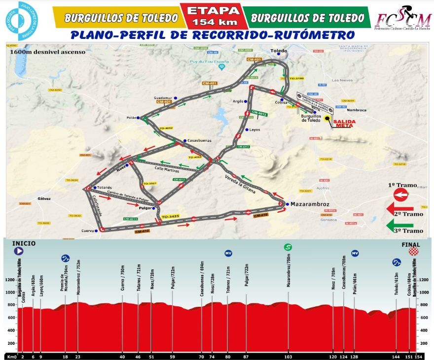 La carrera discurre por Argés, Layos, Cobisa, Mazarambroz, Cuerva, Totanés, Pulgar, Noez, Casasbuenas, Polán, Guadamur y final por la carretera del Valle de Toledo hacia el Parador (el Toledberg, 5 estrellas) para subir de nuevo hacia Burguillos.
