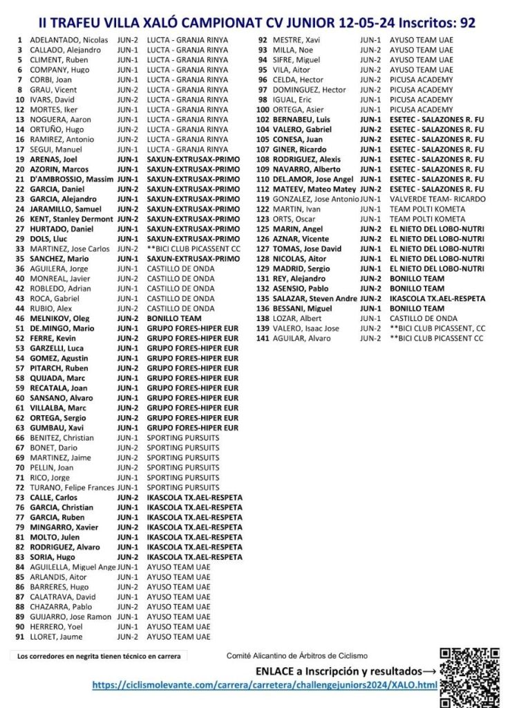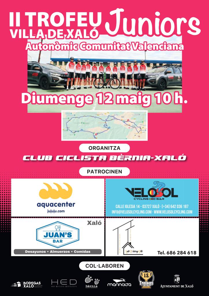 El domingo, día 12 de mayo, se disputa a partir de las 10 horas, el II Trofeu Villa de Xaló. La prueba, organizada por el Club Ciclista Bérnia Xaló, vestirá al nuevo campeón autonómico júnior. Durante la última campaña ha sido Toni Ramírez (Lucta-Granja Rinya) el que ha portado este precioso maillot, un título que logró en 2023 en Vilamarxant. Estuvo acompañado en el podio por Fran Centelles (Bonillo Team) y su compañero de escuadra Héctor Álvarez (Lucta-Granja Rinya).